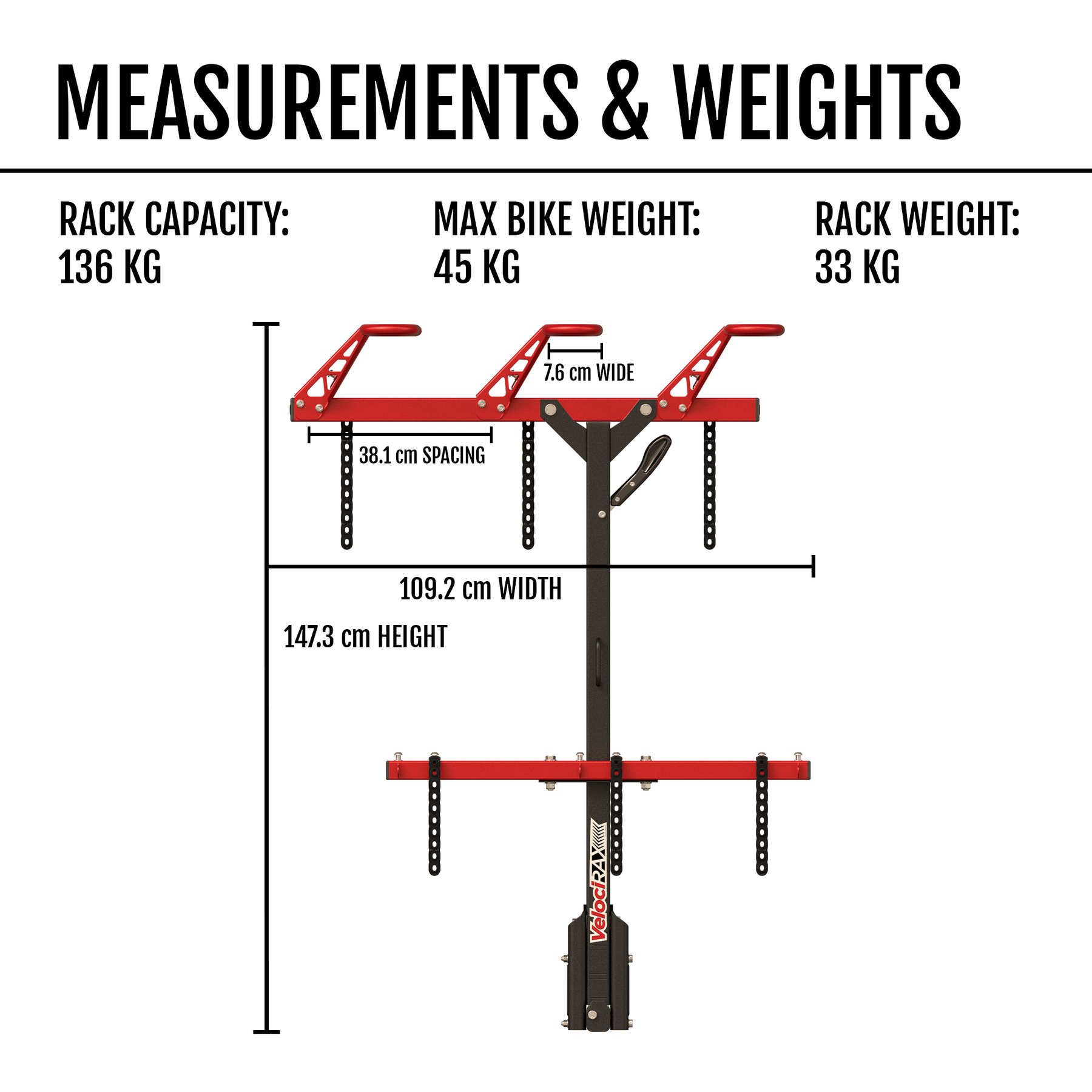 - 136kg total bike weight max (DO NOT EXCEED - Damage to hitch can result)