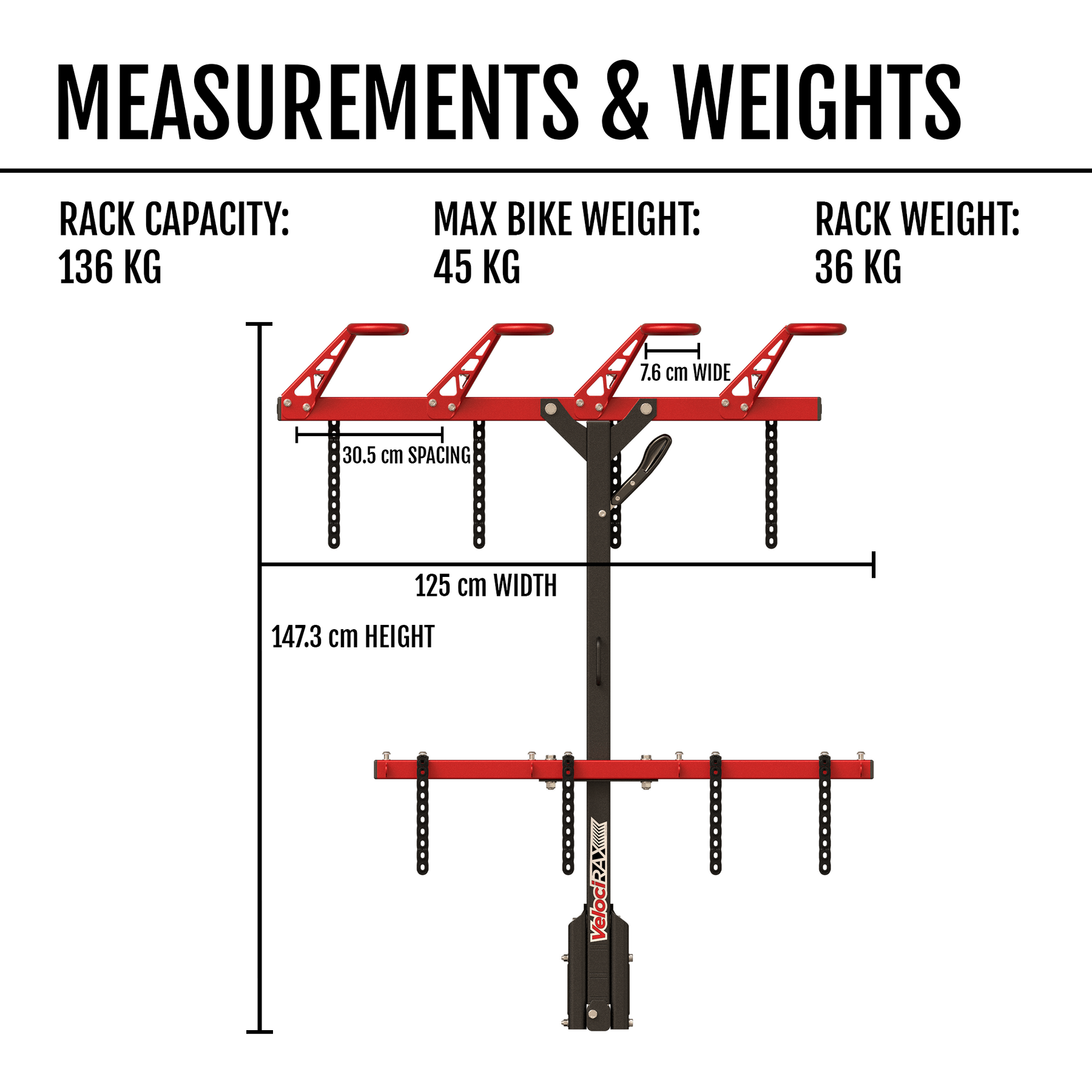 - 136 kg total bike weight max (DO NOT EXCEED - Damage to hitch can result)