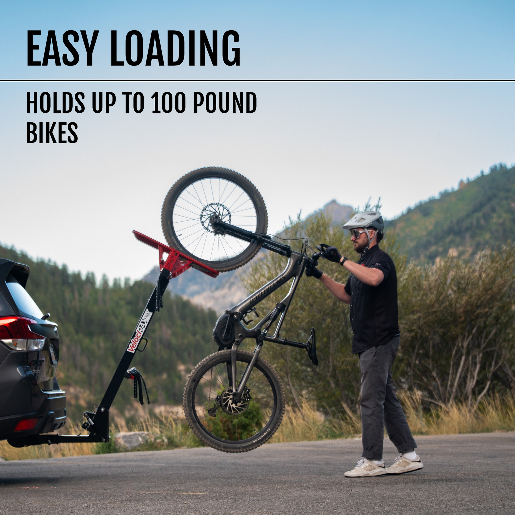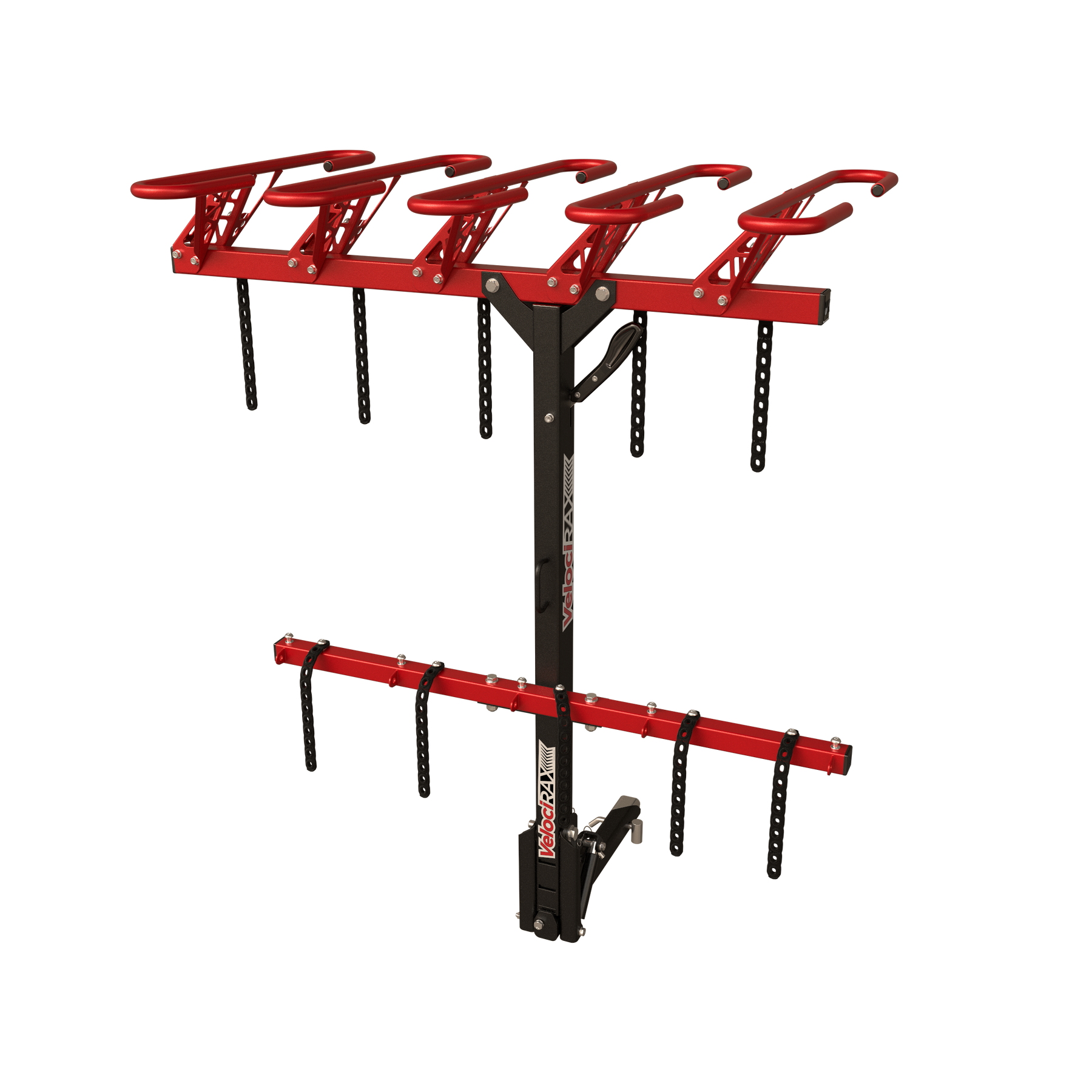 - RVs/Trailers: you will need to have a Class III 50mm (2 inch) hitch receiver (tow bar) with a tongue weight capacity of 227 kg (500 lbs) at a minimum (bumper hitches, extension hitches, and hitches with cantilevered sections allow too much hitch movement and are inadequate). One item to check is if a ladder could possibly interfere with the rack. Trailers and RVs produce extreme forces on racks and bikes. Take extra care to strap tight and use rubber bands (or bike tubes cut in ~ 25mm (1 inch sections)) placed on the brake levers to decrease natural motion between bike and rack and fully secure the VelociRAX's built-in anti-rattle system.