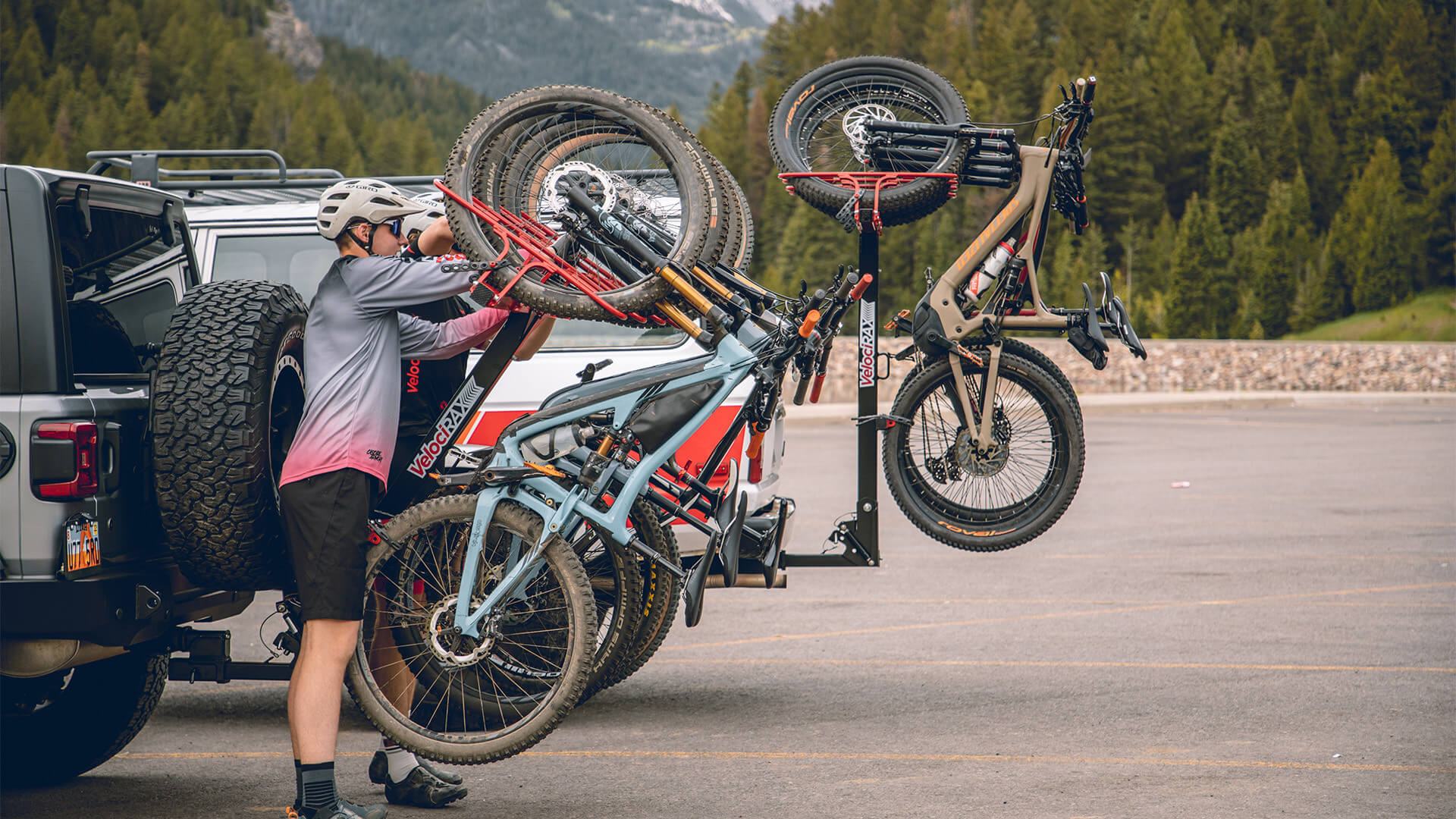 The VelociRAX 6 bike rack for hitches can carry up to 6 bikes and has 254mm (10 inch) spacing between tire baskets. This rack makes road trips with friends and family even better. Using a vertical bike rack for 6 bikes is a game changer whether you're looking to take bikes around locally or explore terrain hours away. UV-tested rubber straps are included to quickly secure bikes in place while ONLY contacting the bike’s tires. When heading out on a bike trip, be confident in how you pack your bikes so you don't have to miss a moment of your trip stressing about bike logistics. If you're looking to get out and ride with others, consider this 6-bike car rack that has room for the whole gang. Getting a rack that has an extra basket carrier that is also great for spontaneous tagalongs!